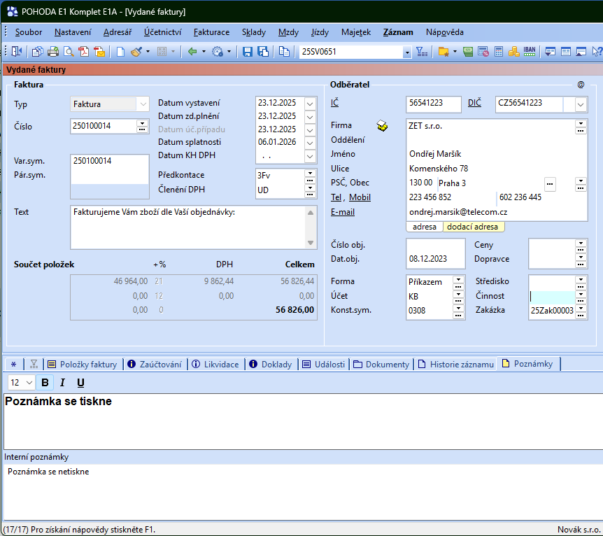 Pokud chcete, aby se poznámka netiskla na doklad, zvolte si v dané agendě dynamickou záložku Poznámky.