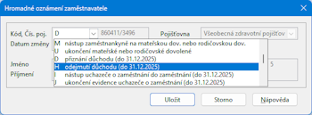 Připomínáme, že kódy do tiskopisu Hromadné oznámení zaměstnavatele můžete vyplnit v agendě Personalistika na záložce Evidence podání.
