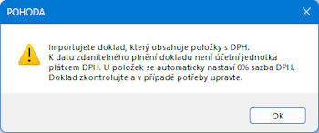 Pokud importovaný doklad spadá do období, ve kterém je účetní jednotka neplátce DPH, a zároveň není v agendě Globální nastavení/Daně/DPH – ostatní zatržena volba Evidovat DPH u výdajů neplátce, nově se položky se sazbou DPH automaticky převedou na 0% sazbu. Do sloupce Částka POHODA zároveň přičte i původní výši daně, aby výsledná hodnota odpovídala celkové částce přijaté faktury. Současně proběhne i přepočet jednotkové ceny položek podle stejného algoritmu jako dosud.
