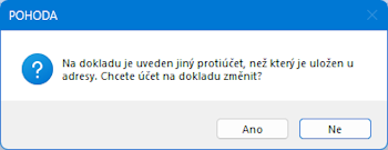 Dosud se při změně odběratele či dodavatele přenesl společně s novou adresou i bankovní účet uvedený v agendě Adresář. Nyní POHODA při této úpravě zobrazí upozornění a nabídne možnost zachovat na bankovním dokladu původní protiúčet, ze kterého nebo na který byl bankovní pohyb proveden.