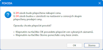 Pro větší přehlednost jsme v agendě Zásoby upravili dialogová okna, která se zobrazují při přecenění nákupních a prodejních cen. Nově se množství přeceňovaných zásob zobrazí červeně.