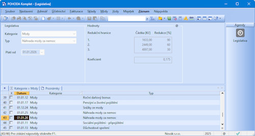 V agendě Legislativa jsme zmíněnou částku nastavili v poli Stát plátcem do limitu u typu Zdravotní pojištění s platností od 1. 1. 2026. Její výše ovlivní výpočet vyměřovacího základu na zdravotní pojištění zaměstnanců, kteří jsou poživateli invalidního důchodu a kteří pracují pro zaměstnavatele, jenž zaměstnává více než 50 % osob se zdravotním postižením.