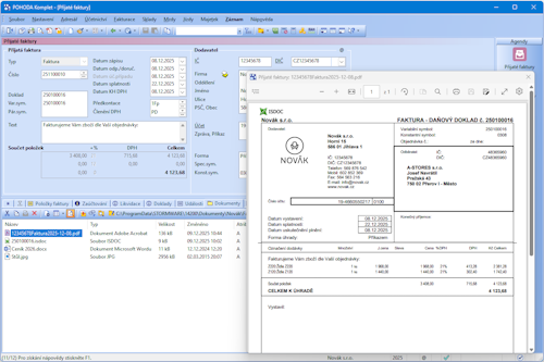 Pomocí ikony nebo klávesové zkratky Alt + Shift + D nyní můžete zobrazit náhled souborů (např. ve formátu PDF, ISDOC, JPG, PNG) uložených na záložce Dokumenty, aniž byste museli otevírat externí aplikace. Pokud okno s náhledem ponecháte otevřené, při procházení jednotlivých dokladů v tabulce agendy se zobrazený dokument automaticky aktualizuje podle prvního souboru na záložce. Díky této funkci si můžete rychle a pohodlně ověřit obsah dokumentů, například zda faktura naimportovaná ve formátu ISDOC odpovídá originálnímu PDF, a výrazně tak zrychlit kontrolu dokladů i každodenní práci.